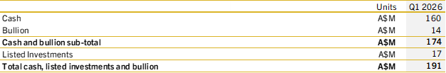 - Likvida medel, ädelmetaller och noterade investeringar uppgick till 191 miljoner AUD, efter återbetalningen av skuldfaciliteten på 45 miljoner AUD och engångskostnader relaterade till sammanslagningen på 25 miljoner AUD.