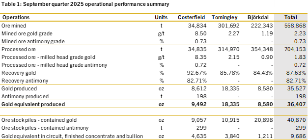2 Koncernens produktion baserad på 100 % bidrag från Tomingley, Costerfield och Björkdal för kvartalet. Eftersom sammanslagningen med Mandalay Resources slutfördes den 5 augusti 2025 återspeglar Alkanes lagstadgade rapporterade produktion för räkenskapsåret 2026 endast produktionen från Costerfield och Björkdal från och med det datumet. Hela kvartalets produktion och kostnader redovisas i slutet av denna rapport.